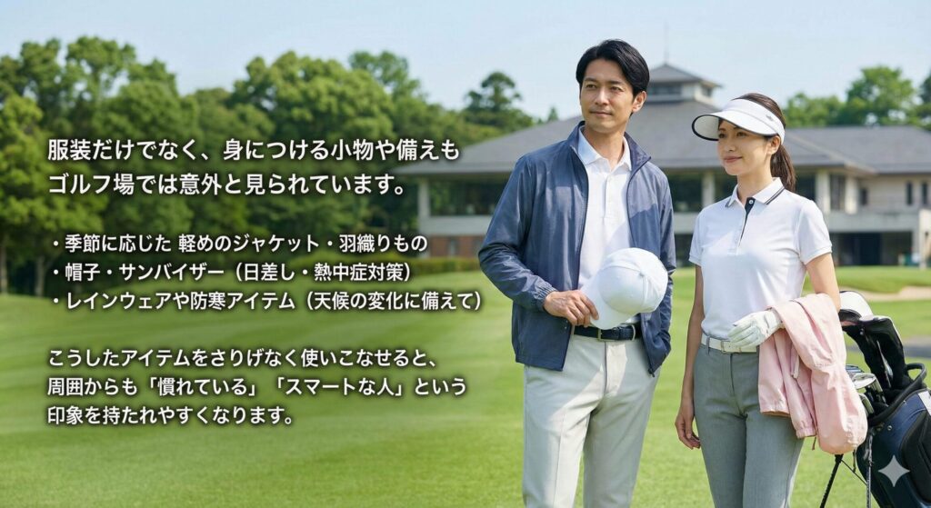 服装だけでなく、身につける小物や備えもゴルフ場では意外と見られています。